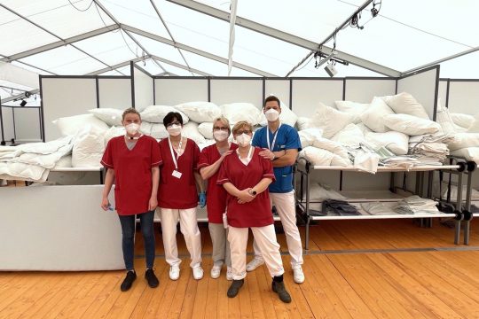 Am 29. und 30. April übernahmen unsere Kolleginnen und Kollegen die Versorgung von pflegebedürftigen Menschen, die kurz zuvor aus dem Donbas evakuiert werden konnten. Im Ankunftszentrum Berlin-Tegel stehen derzeit zahlreiche Versorgungswagen, unter anderem auch des Deutschen Roten Kreuzes. Mit viel Herzblut und großer Motivation haben unsere Mitarbeitenden, bestehend aus der Geschäftsleitung und engagierten Kolleginnen aus unseren Seniorenwohnheimen, die Pflege in den zwei großen Zelten des DRK übernommen. In drei Schichten übernahmen die Freiwilligen von der Erstversorgung bis hin zur Verlegung in die Pflegeeinrichtungen, u.a. der Sozialdienste der Volkssolidarität Berlin.