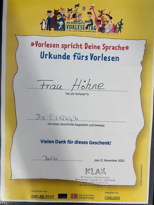 Zum Vorlesetag am 21.11.2025 bereitete unsere Bewohnerin Frau Höhne einer Kita-Gruppe mit der „Eiskönigin“ eine ganz besondere Freude. Die Kinder lauschten gespannt, waren sichtlich verzaubert und gingen mit dem Wunsch nach Hause, bald wiederzukommen.